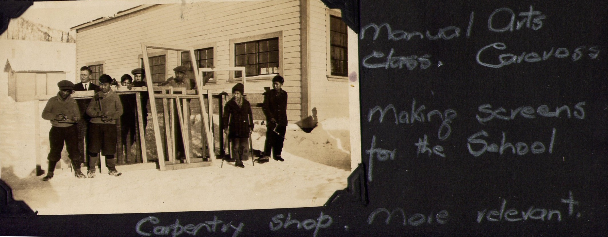 My grandfather was determined that education should be practical, relevant and to support the lives of students “where they were.” His pictures of classrooms showed his style of having students work on projects that not only taught them skills no doubt but also contributed to the construction of the school. In the image of the carpentry shop, he writes about making screens for the school and “more relevant” are the words he uses to describe this manual arts class.